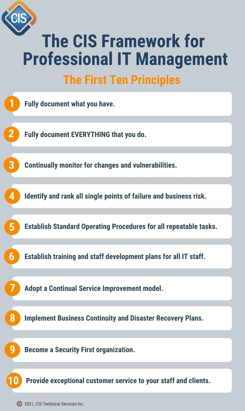 Below are the first ten principles of our IT Management Framework for small businesses. Implementing these basic guidelines, whether you have internal IT staff, or outsource the function to a Managed Service Provider, will help provide a solid foundation for success.